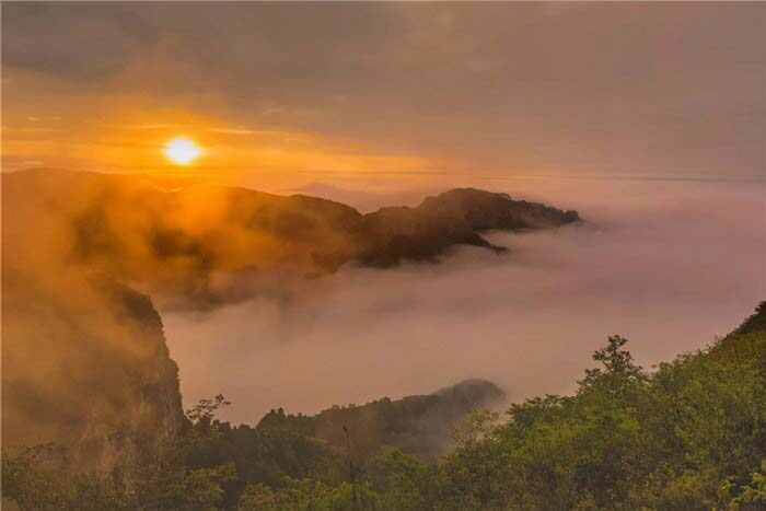 翠屏旭日乃畢節古八景最早的一景,位于位于三板橋街道安家井翠屏山。因明代大文學(xué)家楊慎途經(jīng)畢節,游翠屏山留下“翠屏旭日”一詩(shī)而得名,歷代都有文人登臨贊頌,使翠屏山成為畢節城郊古八景之一。每日清晨,晨曦初露,旭日東升,山間原野,草木茂盛;日出山色秀麗,白虹貫日;月升清輝熹微,丹霞似錦。翠屏旭日,實(shí)乃一大盛景,名傳千古。
