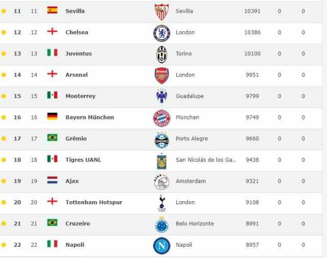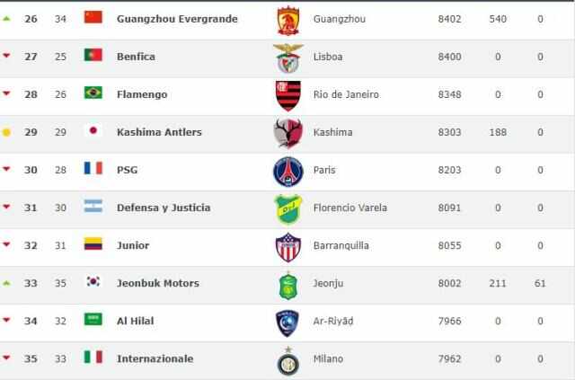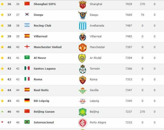在23,中超已經(jīng)有4支球隊進(jìn)入前50名,亞洲排名第一的是韓國球隊蔚山現代(世界第23位),廣州恒大排名亞洲第二(世界第26位),上海上港世界第36位,是中國排名第二的俱樂(lè )部。除了恒大和上港,國安排名第46,魯能第50。