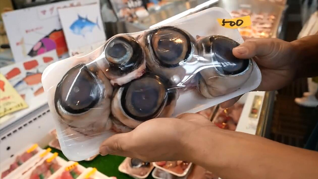 金槍魚(yú)在日本是一種非常名貴的魚(yú)類(lèi),魚(yú)肉可以用來(lái)做刺身,價(jià)格也非常昂貴??墒谴蠹抑绬?日本人連金槍魚(yú)的眼睛都不放過(guò),他們會(huì )用刀子在金槍魚(yú)的眼眶上咔咔劃上幾刀,然后把金槍魚(yú)的眼珠子給掏出來(lái),新鮮的金槍魚(yú)眼珠子有液體存在。膽兒大的老鐵可以直接把液體喝掉,之后再把兩只眼珠子放在盤(pán)子里撒上一些調料,或蒸或生吃都可以,聽(tīng)上去就很殘忍,估計只有日本人敢吃了吧!