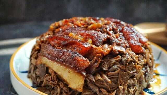 梅菜扣肉是福建地區的一道傳統家常菜,當地人非常喜歡在過(guò)年過(guò)節的時(shí)候烹飪享用。梅菜扣肉以永定地區的梅菜干和豬肉作為主要食材,通過(guò)泡發(fā)、蒸制的步驟制作而成。成菜后的梅菜扣肉外觀(guān)是深褐色的,非常挑戰人的味蕾。吃到嘴里也是軟爛的,真的是一道肥而不膩的好菜。