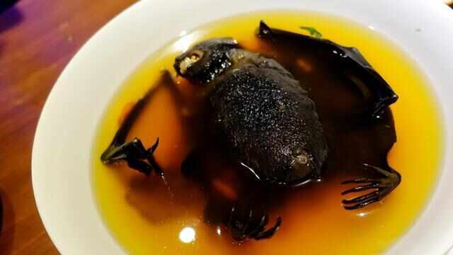 由蝙蝠制成的湯不知道大家有沒(méi)有見(jiàn)過(guò)?蝙蝠湯是帕勞特色美食,帕勞呢是太平洋上的一個(gè)小島國,那里的蝙蝠數量是相當的多,所以當地人把蝙蝠當作食材,制成湯或者做菜也就不足為奇了。只不過(guò)咱們中國人會(huì )覺(jué)得這是一道黑暗料理,正經(jīng)人誰(shuí)會(huì )去喝蝙蝠湯啊,染上細菌病毒的話(huà)就不得了了。如果你在帕勞喝蝙蝠湯,就能發(fā)現服務(wù)員會(huì )先上湯,這樣一碗濃郁的高湯端上來(lái),一時(shí)間你會(huì )忘記它是由蝙蝠制成的,等到湯喝的差不多的時(shí)候,服務(wù)員便會(huì )把熬湯用的蝙蝠呈上來(lái),既有肉吃又能喝湯,這樣的“美食”你享受的了嗎?