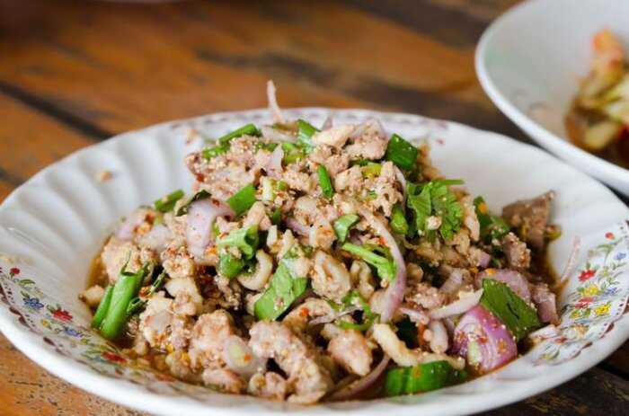泰式肉碎沙拉是一道泰國傳統菜肴,以炒熟的肉碎為主要成分。它通常搭配新鮮的蔬菜、檸檬汁和辣椒等調味料,味道酸辣可口,是一道具有東南亞風(fēng)味的沙拉。