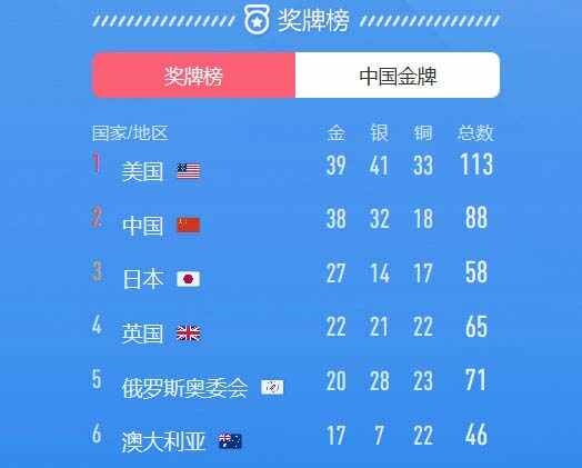 當然這個(gè)獎牌榜,是以參與奧運會(huì )獲得的金牌數來(lái)排列的,如果是以獲得獎牌總數來(lái)排列的話(huà),則是美國第一,中國第二,俄羅斯奧運隊第三,英國第四,日本第五。