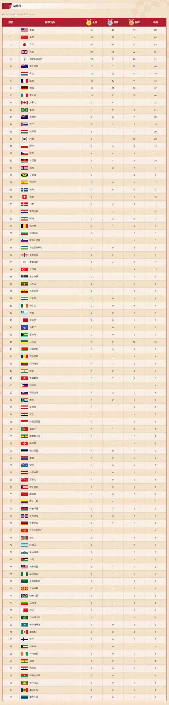 排名第二的是中國,中國獲得了38枚金牌,僅比美國少一枚,銀牌則是有32枚,銅牌是18枚,總數為88枚獎牌。
