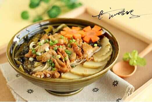 小清新的面條,是杭州一帶著(zhù)名的湯面,也集成了那里婉轉柔情的風(fēng)格,面湯清淡鮮亮似清水,但嘗上一口卻是格外鮮美,面的澆頭主要由雪菜、筍片、瘦肉絲組成,鮮美可口。