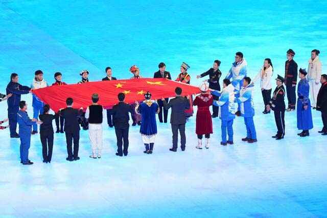 五星紅旗與奧運五環(huán)標志一起閃耀在北京冬季奧運會(huì )開(kāi)幕式現場(chǎng)。