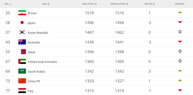 與上期相比,國足的積分從1327上漲至1333,世界排名上升一位,排名第73位。