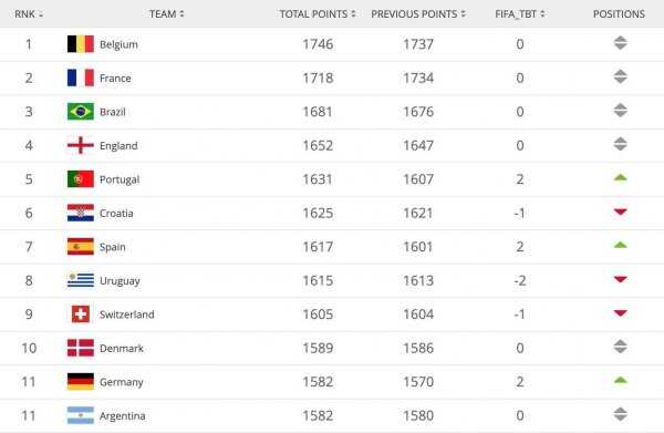 此外,在世界排名方面,比利時(shí)排名繼續排名第一,法國、巴西和英格蘭分列2、3、4名。剛剛取得歐國聯(lián)冠軍的葡萄牙上升兩名,目前排在世界第5。德國上升2名,與阿根廷并列世界第11名。