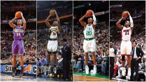 雷·阿倫可謂是一名資深的射手了,以“君子雷”/“君子劍”著(zhù)稱(chēng)。其標志性的動(dòng)作便是出其不意的起跳以及快如閃電的出手速度,同時(shí)無(wú)球找空位的能力也非常出色,空檔三分更是猶如探囊取物那般簡(jiǎn)單。除此之外,雷-阿倫還是NBA史上最好的罰球手之一,其生涯罰球命中率高達90%+。